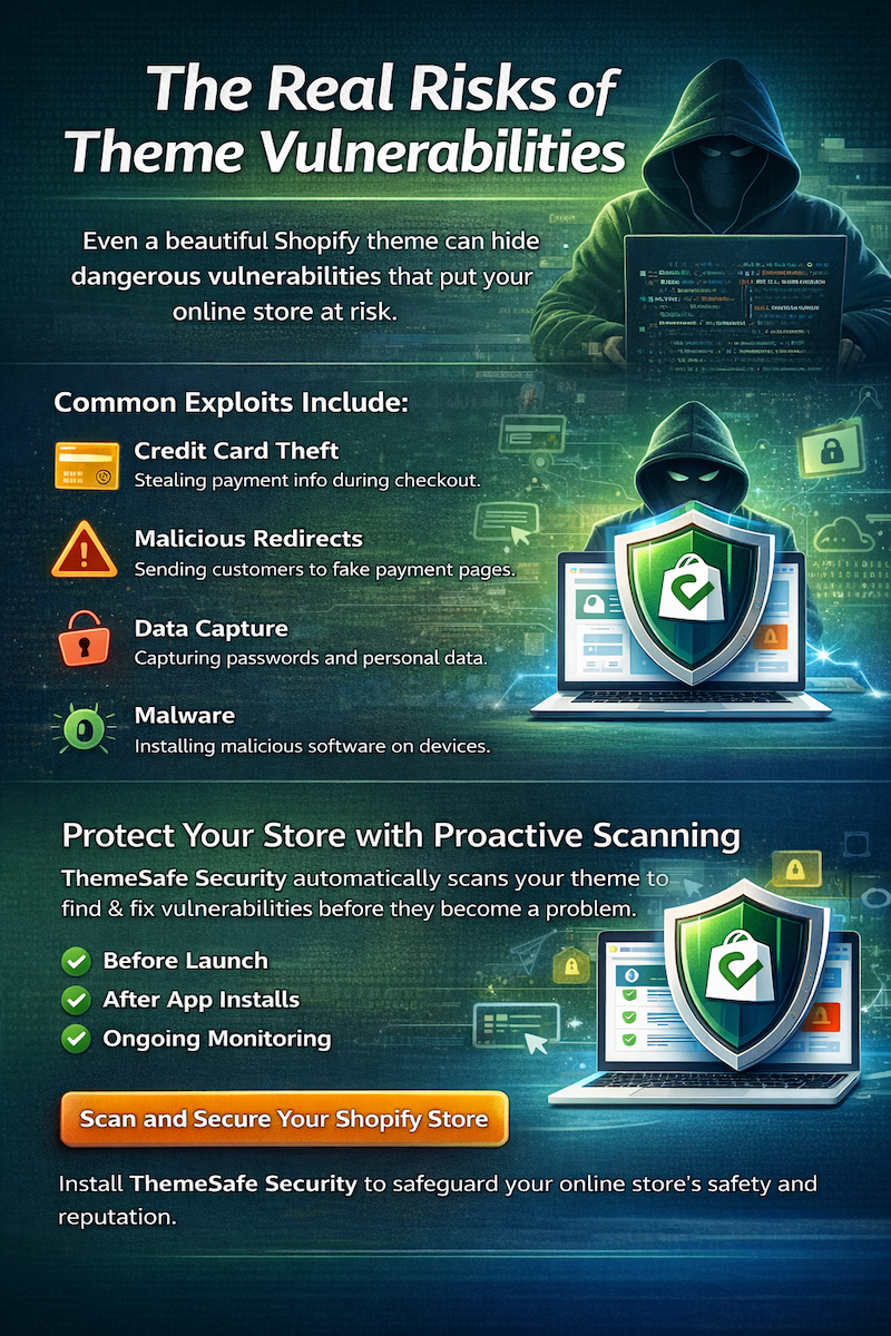 Most merchants have no idea if their theme is vulnerable, but attackers actively exploit these weaknesses to cause significant damage. According to the sources, common exploits include: